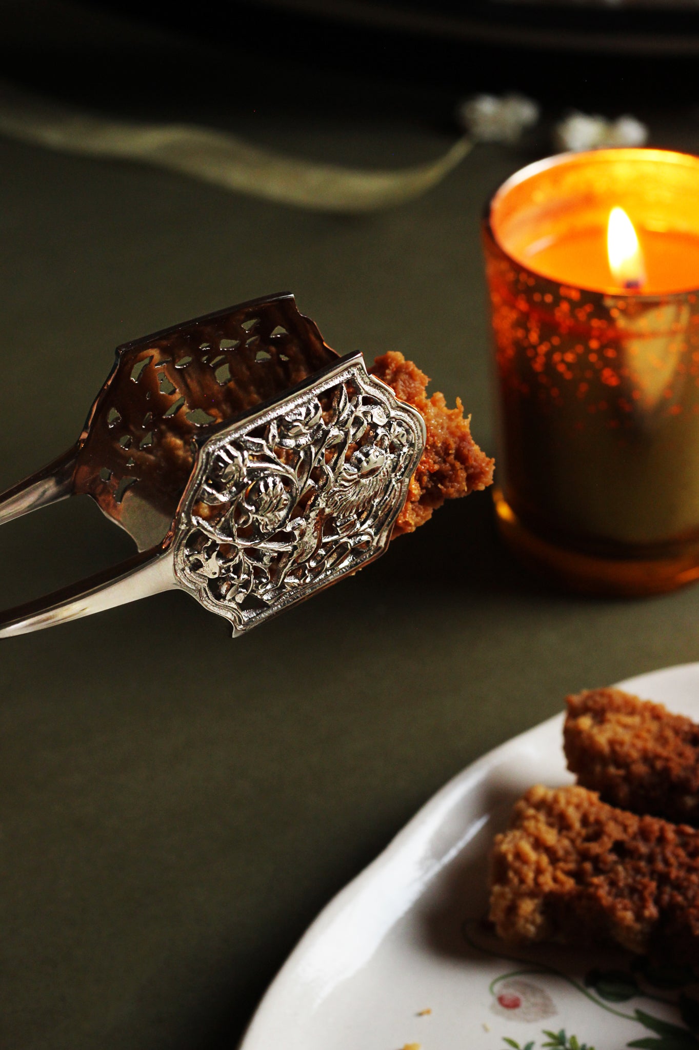 Refined serving everyday, all articulated through the distinct aesthetic style. Intricate detailing and cast brass tongs with floral cut outs are accompanied with Bagh platters, making this pair an excellent housewarming or wedding gift.