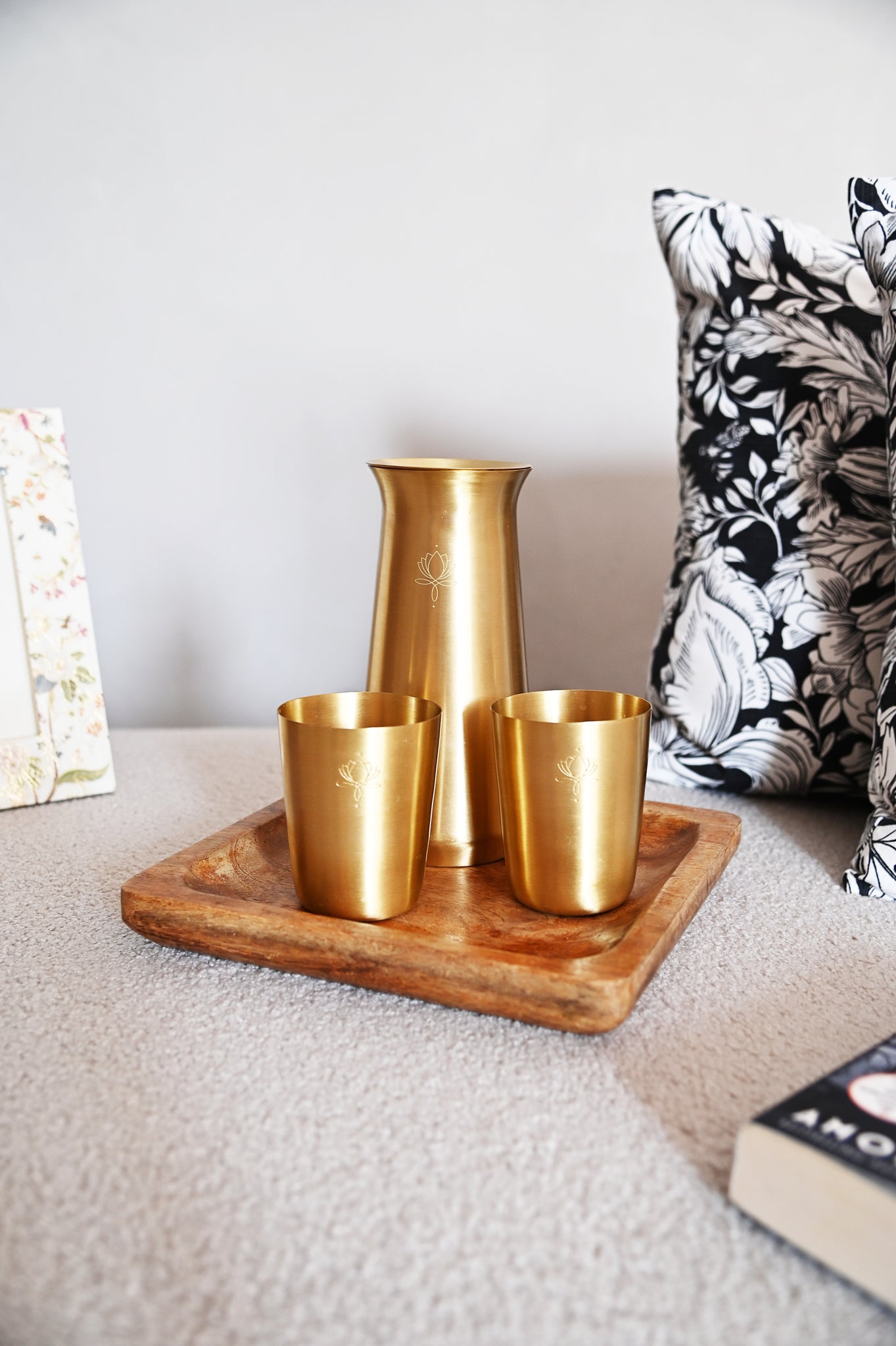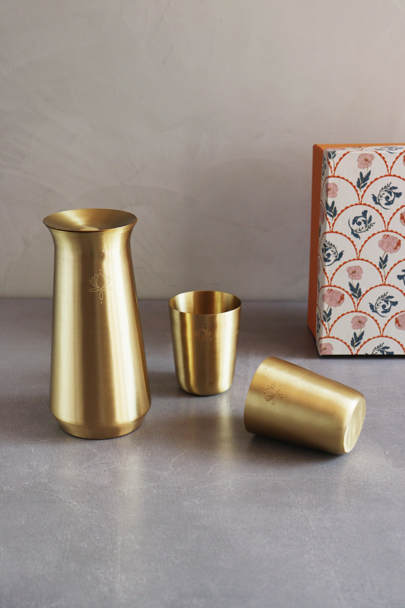 A gift box which is a modern take on traditional materials.Set of Brass jug with 2 Brass glasses.