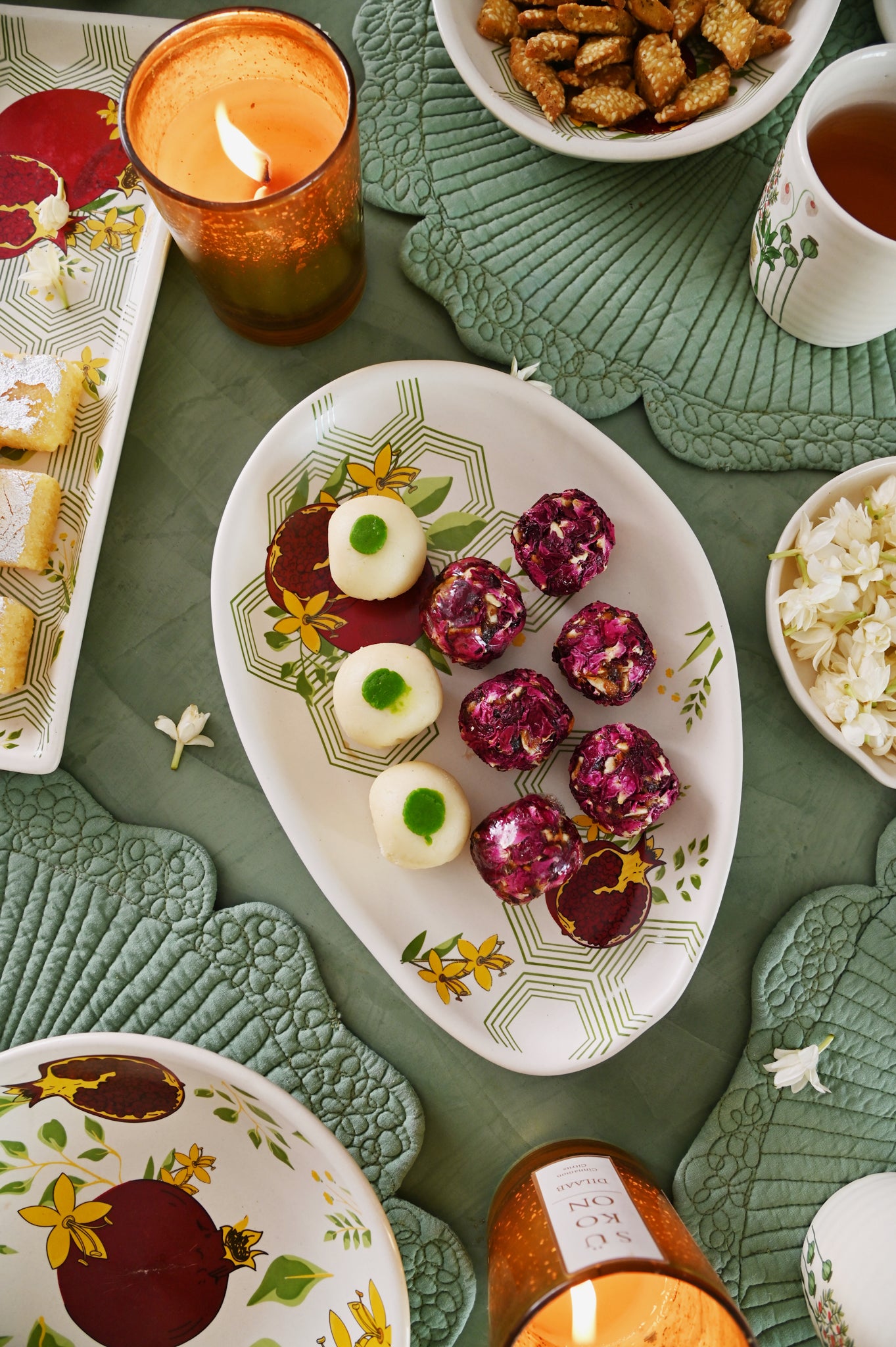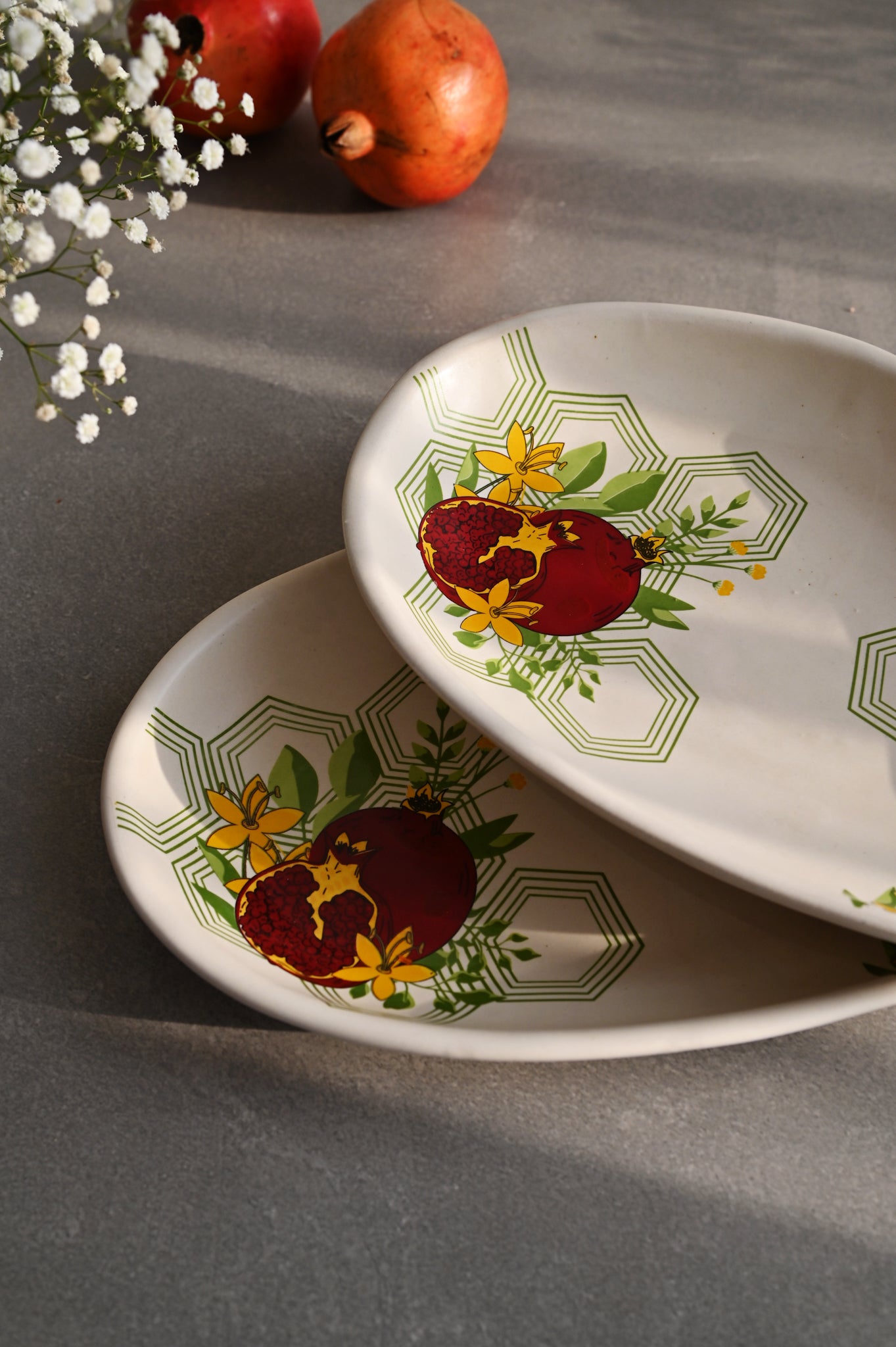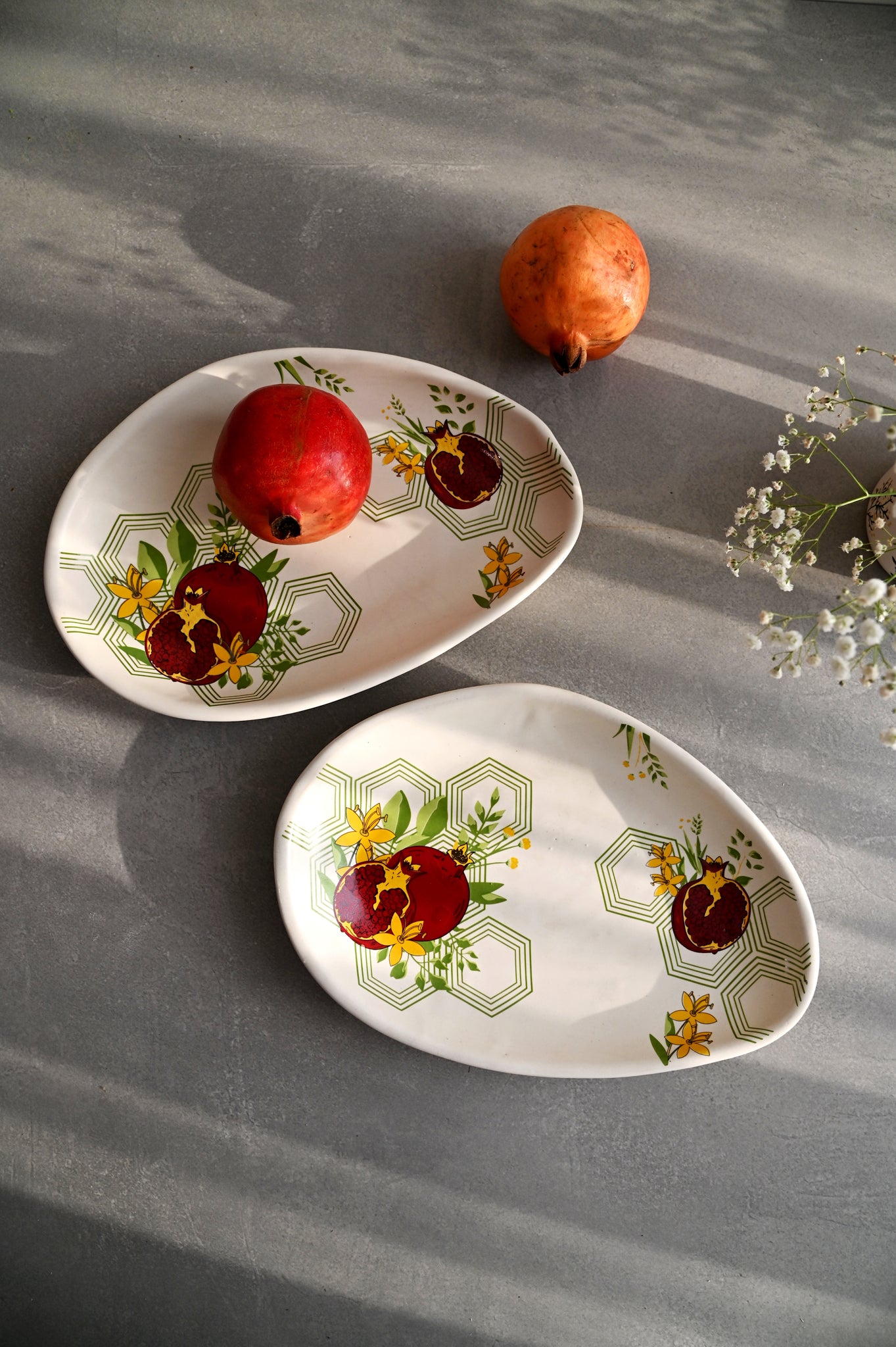Pieces that provide the foundation for a bold and inspiring tablespace. The Daadim collection embodies this striking approach to design in its pomegrante motifs, which are made on an Organic shape serving platter.