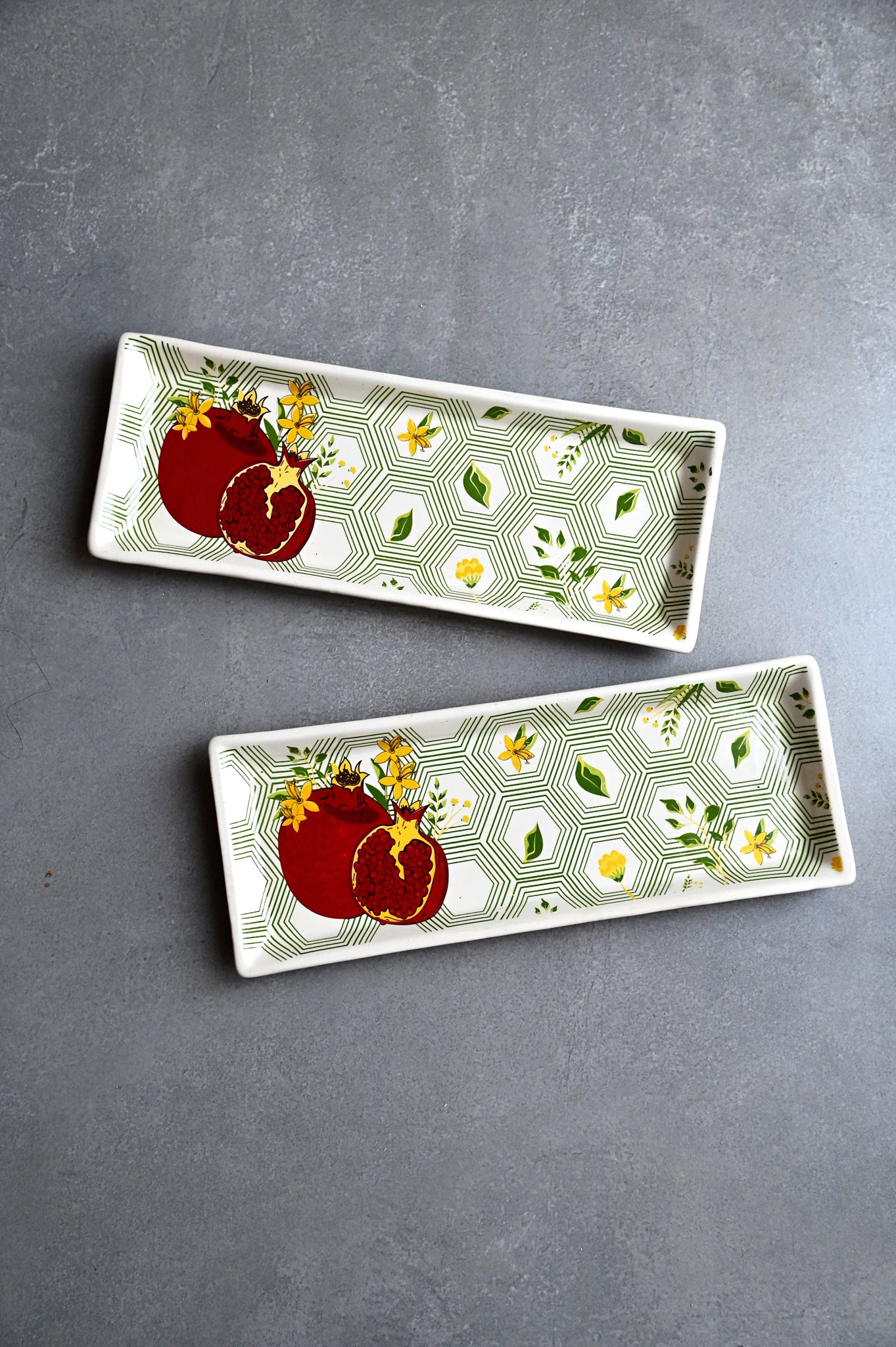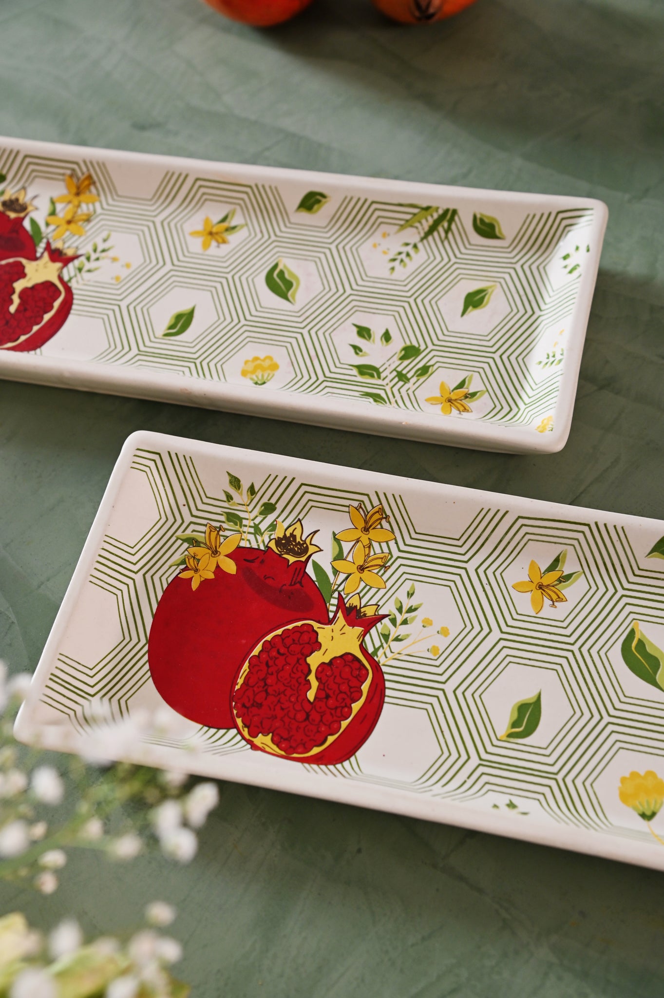A charming love letter to the Pomegranate Gardens. Dadim collection celebrates the fruit of abundance, with its leaves, flowers and lustrous detailing. A whimsical yet refined choice for celebratory events, this tray is perfect for serving everything from sandwiches to canapés to cookies.