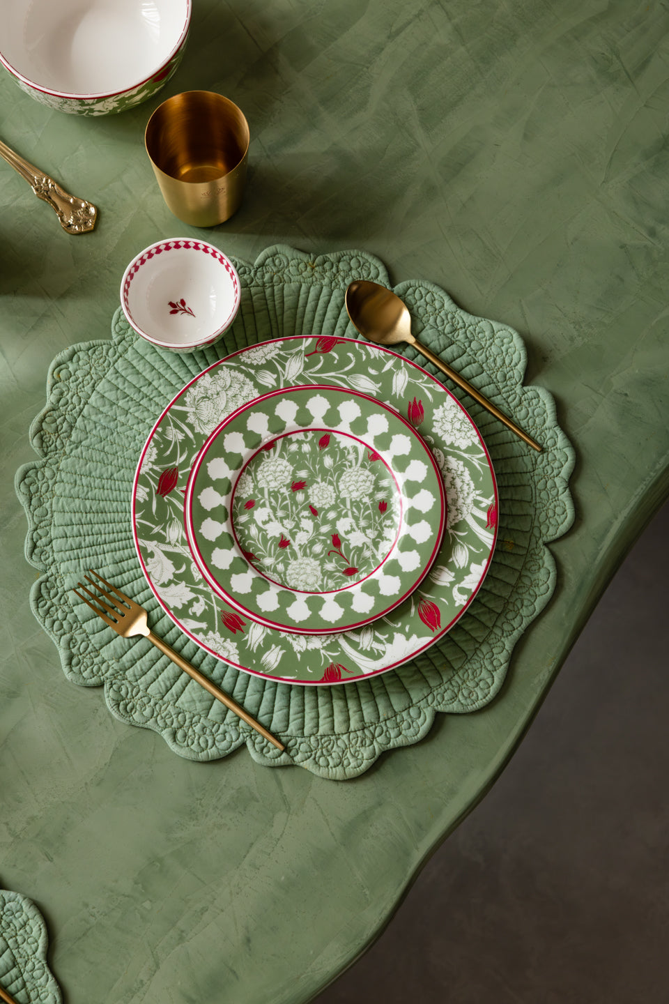 The Tarang Dinner Plate brings the rhythm of the collection into full view - delicate florals unfolding across a soft porcelain surface. There is detail, yet a sense of calm.