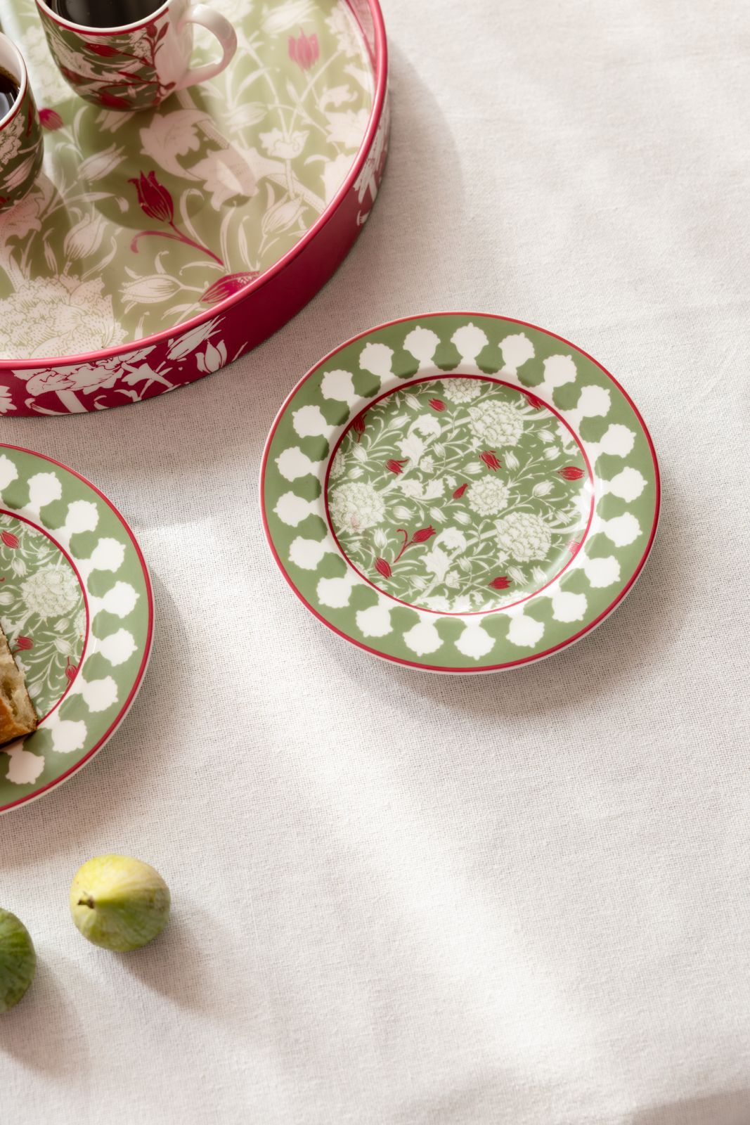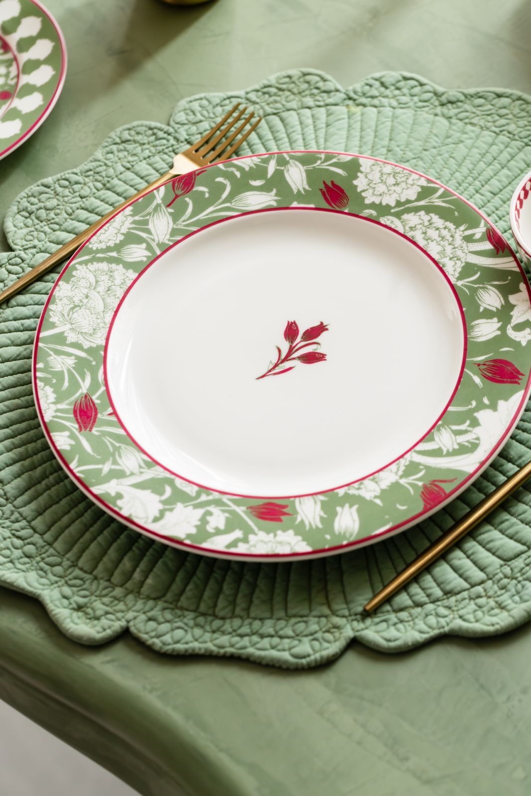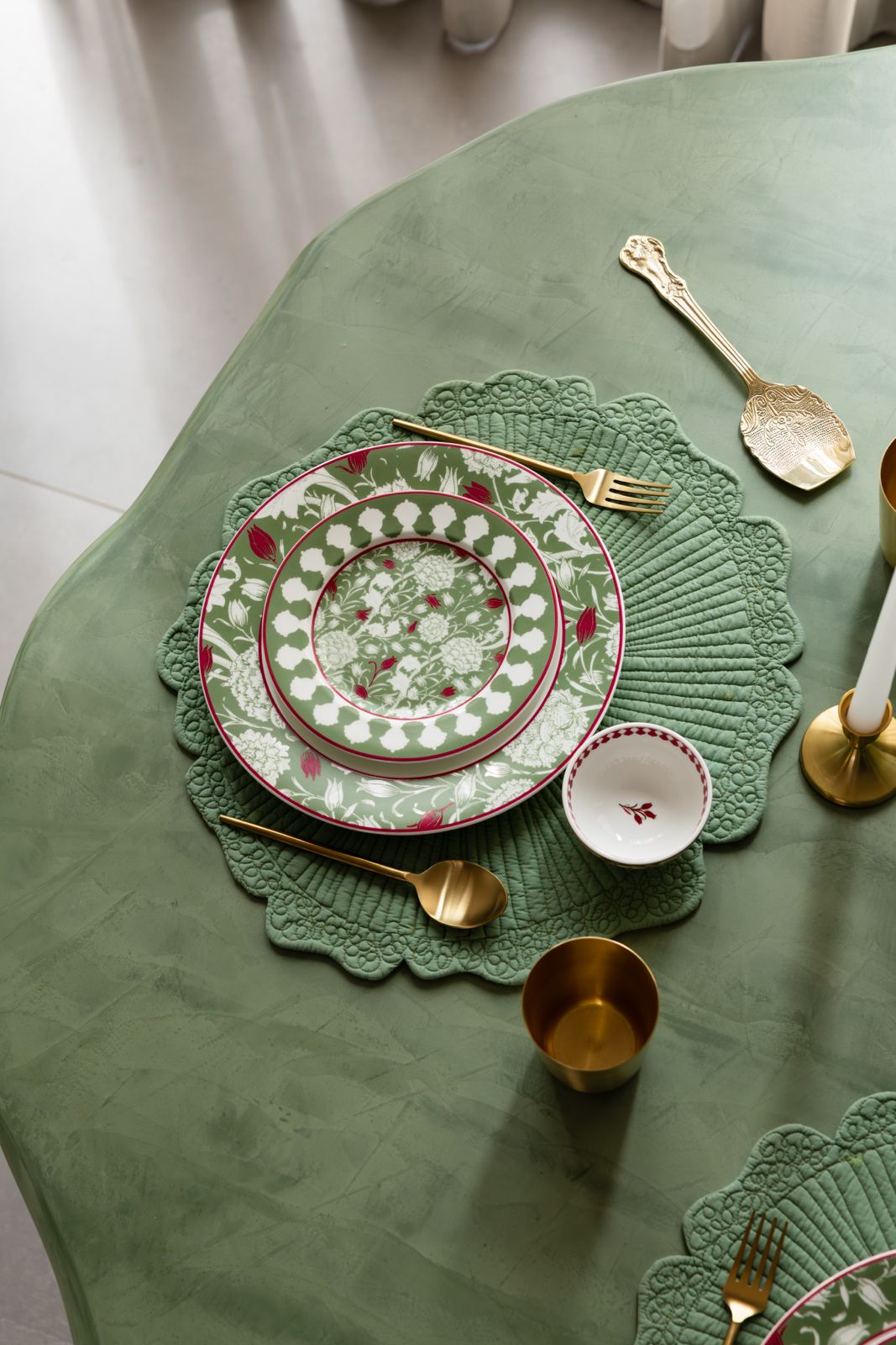 The Tarang Dinner Set brings together the full rhythm of the collection - six dinner plates, six quarter plates, six katoris, and two serving bowls. Each piece carries the same quiet movement of florals and borders, coming together as a composition rather than a collection.