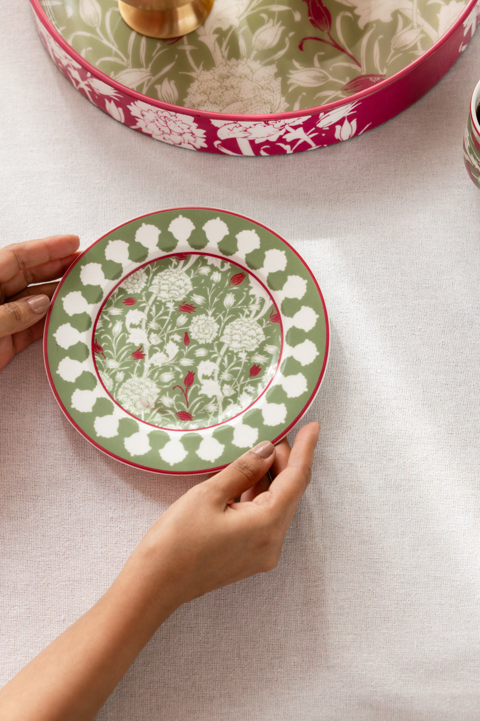 The Tarang Quarter Plate carries the most intricate expression of the collection - its surface alive with delicate florals, that feels both precise and effortless. There is a quiet richness to it, a detail that reveals itself slowly, the more you look. Perfectly sized for moments in between - desserts, sides, or something shared - it brings a sense of completeness to the table without ever asking for attention. Crafted in fine porcelain, its presence is light, yet unmistakable.