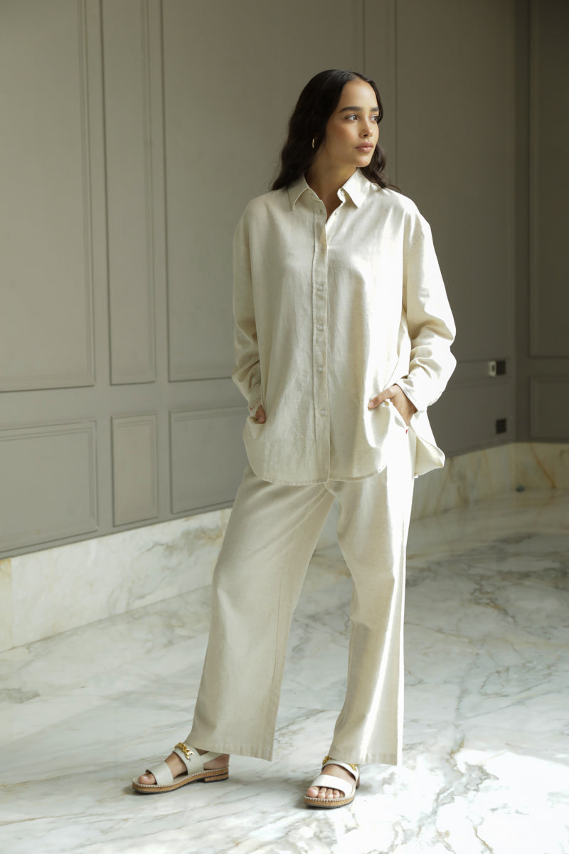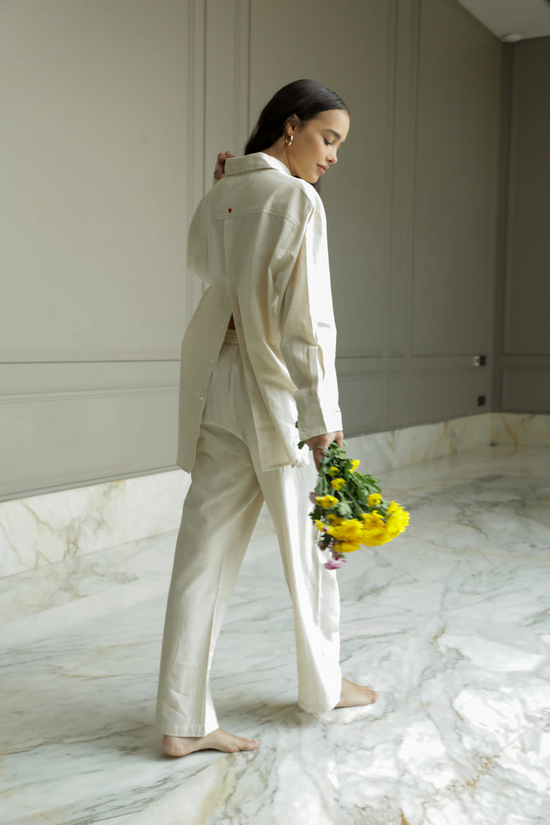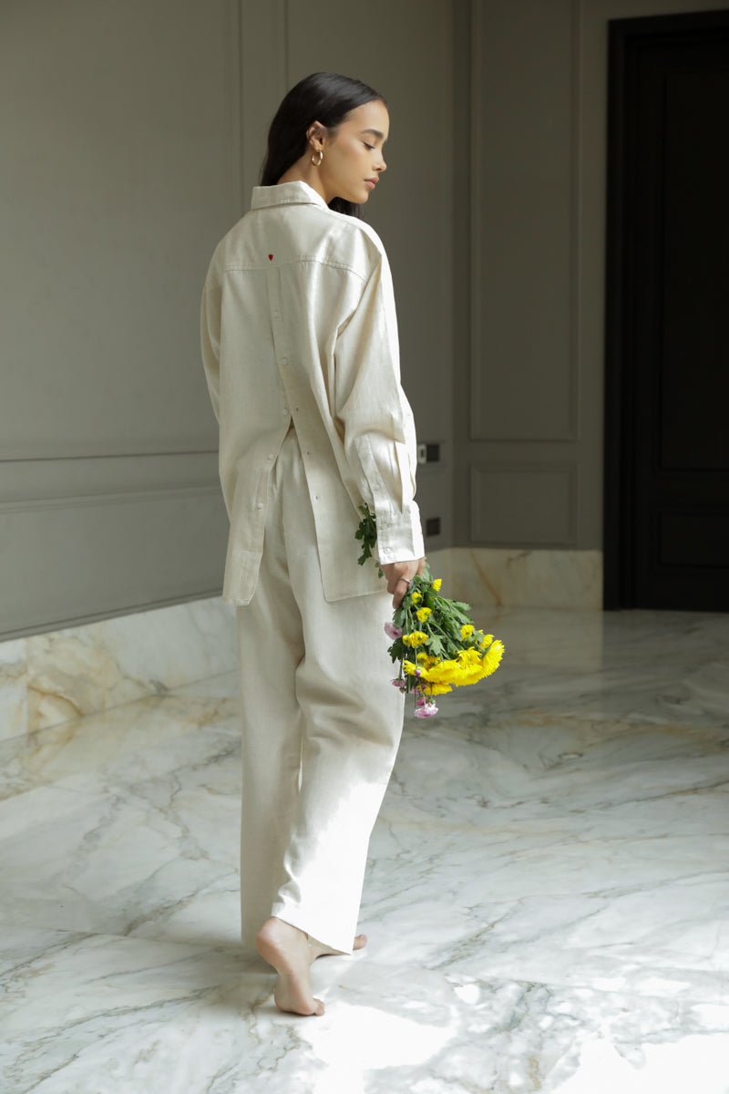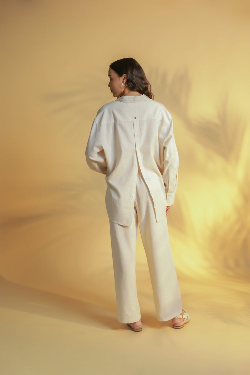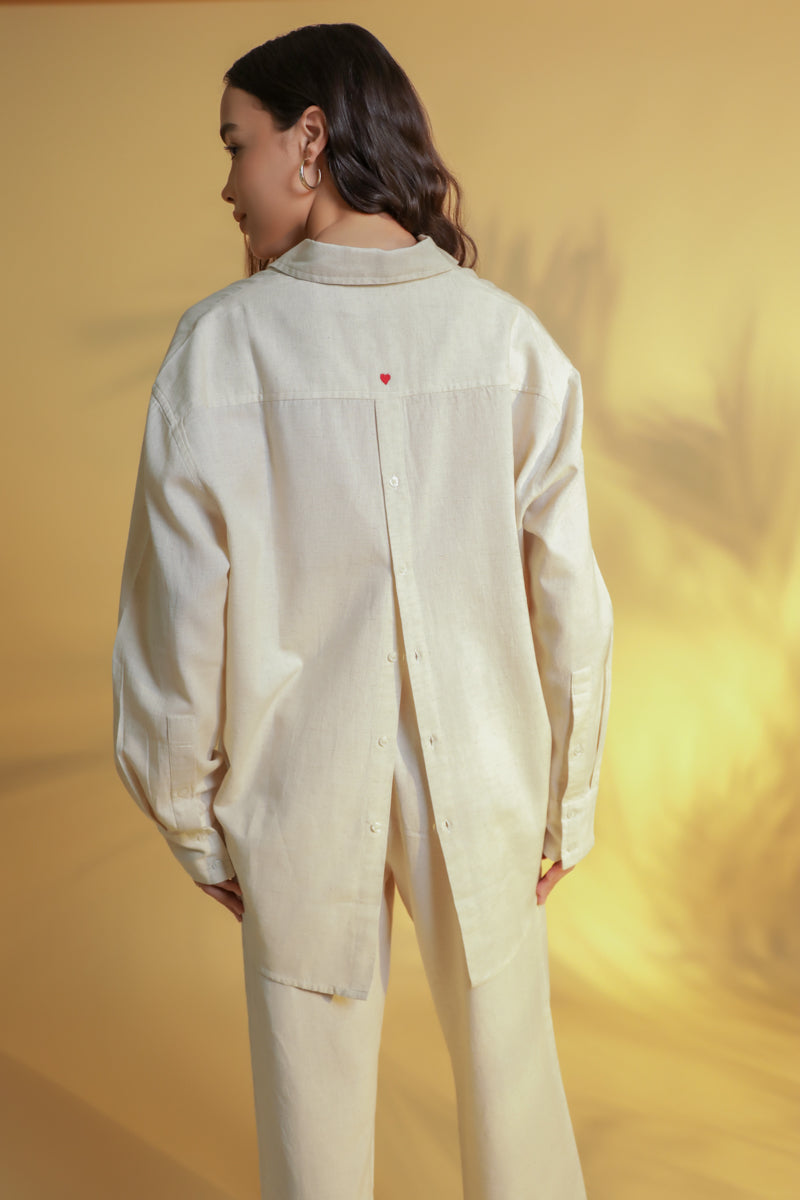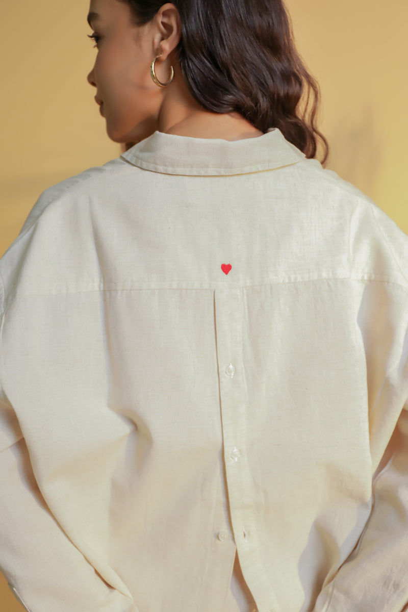 A classic cotton linen button-down shirt with button detailing at the back. Find a spirited heart embroidered on the back.